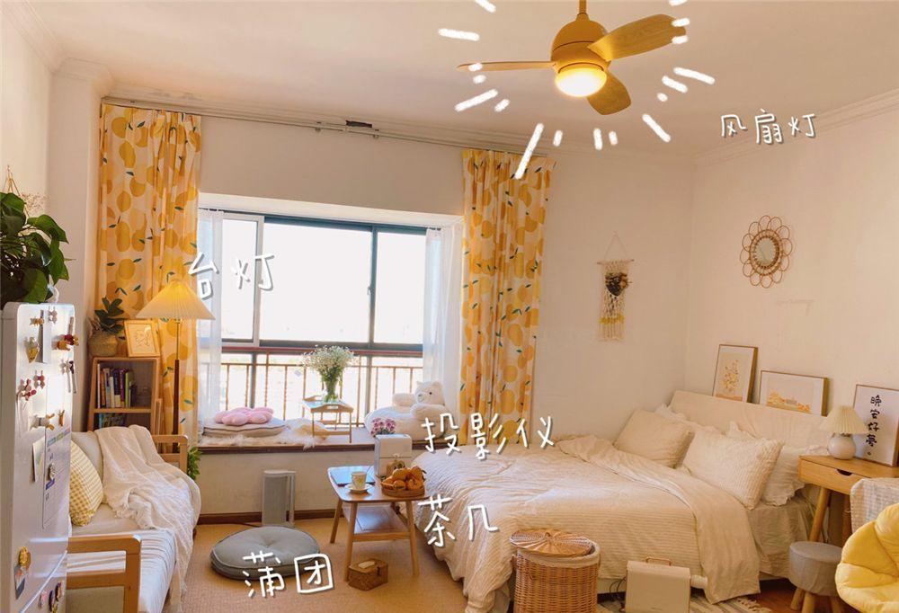 改造完成后,加入了很多温馨柔和的软装装饰,床头的老旧面板被罩住,替换了窗帘、地板,并用投影仪代替电视,居住舒适性大大提升。