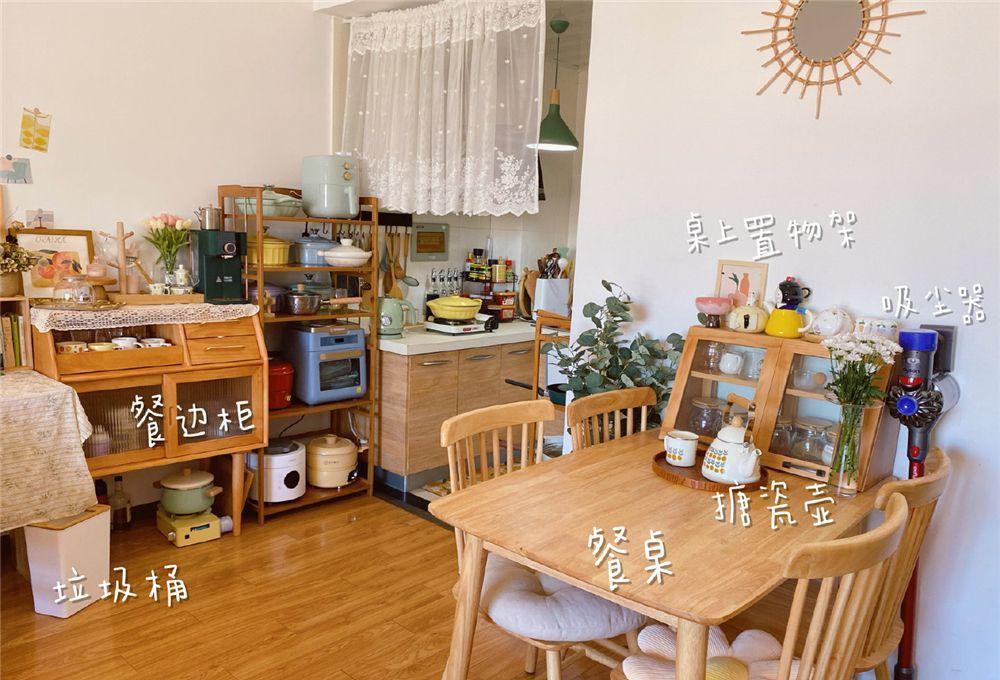 厨房面积非常小,老旧的橱柜看上去没有质感,收纳空间和台面空间不足。改造后添加了木架增加小电器收纳位置,橱柜用木纹贴纸装饰,窗户上安装简易百叶窗。