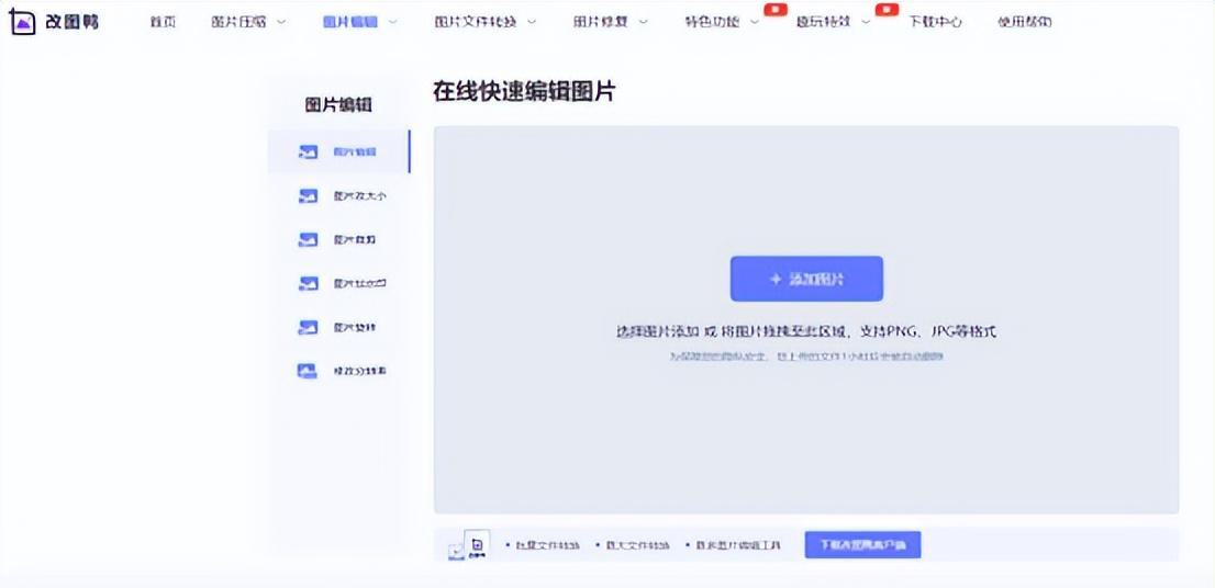 改图鸭是一款优秀的在线图片编辑网站,功能实用,免注册,包括图片压缩、图片编辑、图片文件转换、照片修复等功能,满足用户日常需求。