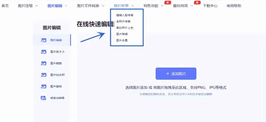 点击改图鸭首页【照片修复】,可以看到改图鸭有五个照片修复功能,其中包括【模糊人脸修复】、【老照片修复】、【黑白照片上色】等,非常实用。
