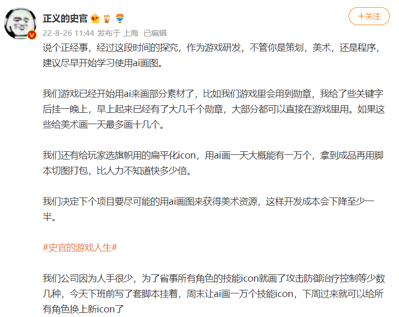 将AI作为辅助工具看待的网友们则认为,AI绘画带来高效便利,魔法禁书目录等作品的画师灰村清孝更认为AI可降低“沟通成本”。