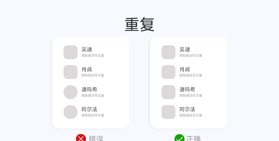 重复指整体一致使用视觉元素、模式和交互,建立熟悉度、强化品牌并引导用户使用界面。
