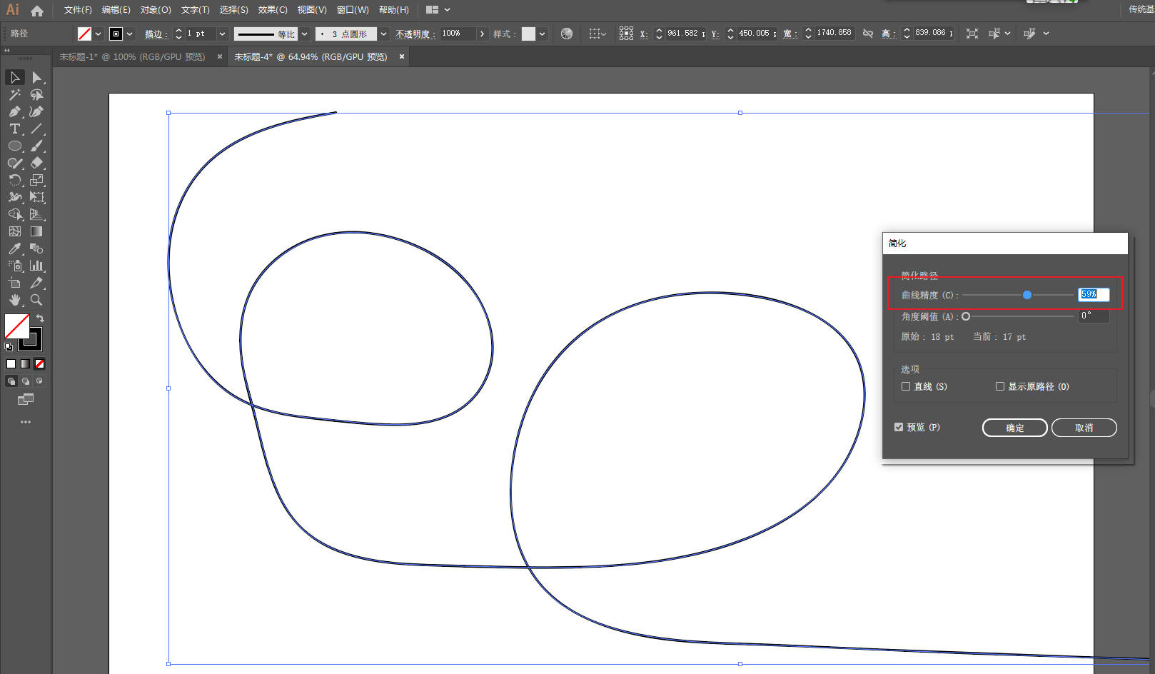 2、选择【对象】→【路径】→【简化】,进行数值的调节,调整线条的平滑度。