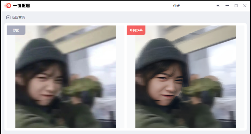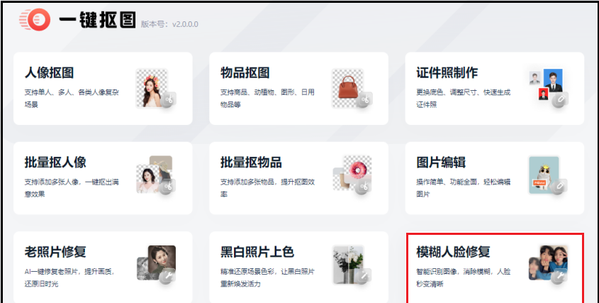 步骤一:打开一键抠图工具,在功能菜单中选择【模糊人脸修复】,上传需要修复的照片。