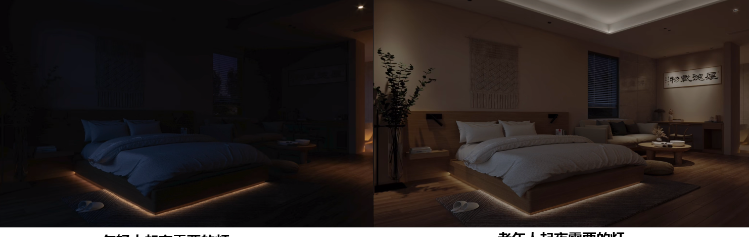 考虑到老人的特殊需求,起夜时需要更明亮、更安全的灯光。推荐在床头、门口、过道、卫生间等位置安装低位感应式小夜灯。