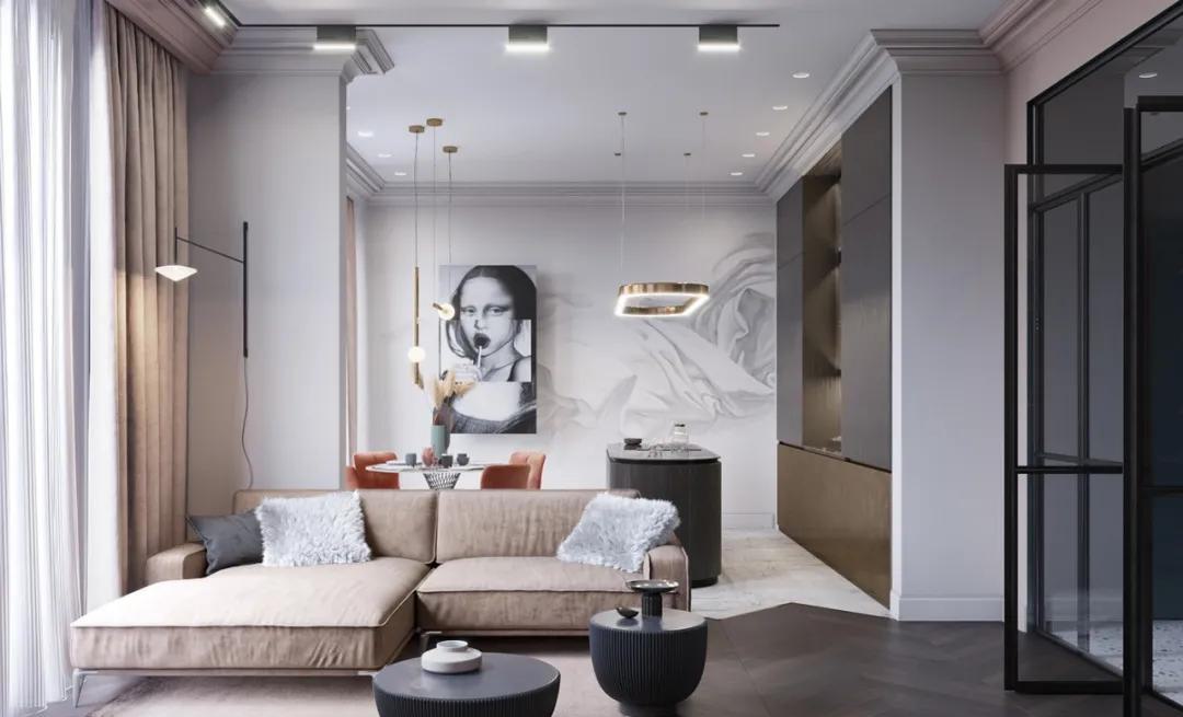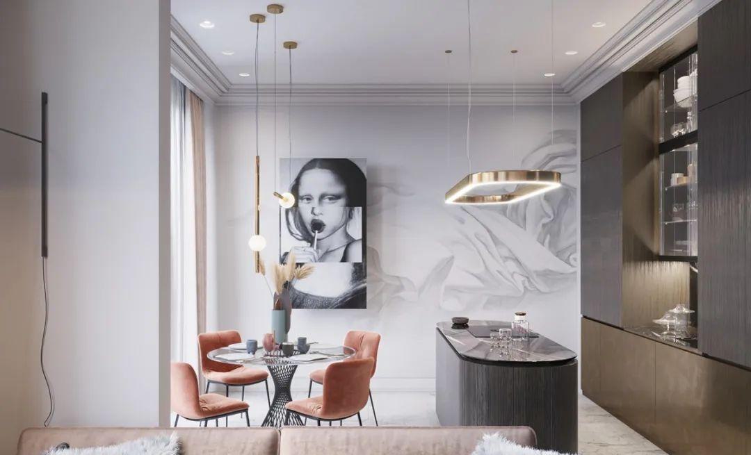 这里展示了一套来自俄罗斯设计师的案例,采用了舒适的莫兰迪色系,融入时尚抽象设计,高级又耐看。客厅以石膏线条造型取代吊顶设计,橙色点缀活力吸睛。餐厨区使用蓝橙互补配色,色彩冲突恰到好处。卧室配色深重温馨,衣橱玻璃与黄铜材质展现轻奢韵味,卫生间白粉配色精致漫不经心。