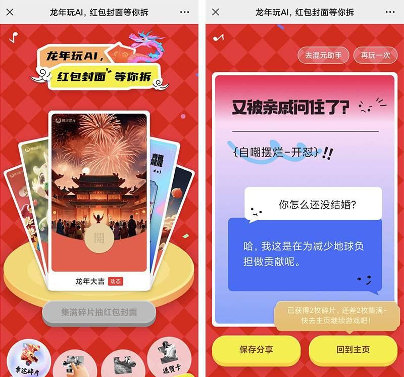 项目亮点:用户可参与三种不同玩法,完成后即可抢到红包封面。从选择回应亲戚,制作带对联的海报,到发送祝福卡片,AI助力您尽情感受节日氛围。