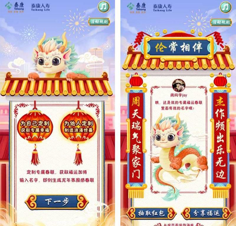 项目亮点:H5采用喜庆色彩,配合卡通小龙,营造浓厚的节日氛围。用户填写昵称即可生成对联,为新春增添祝福与快乐。