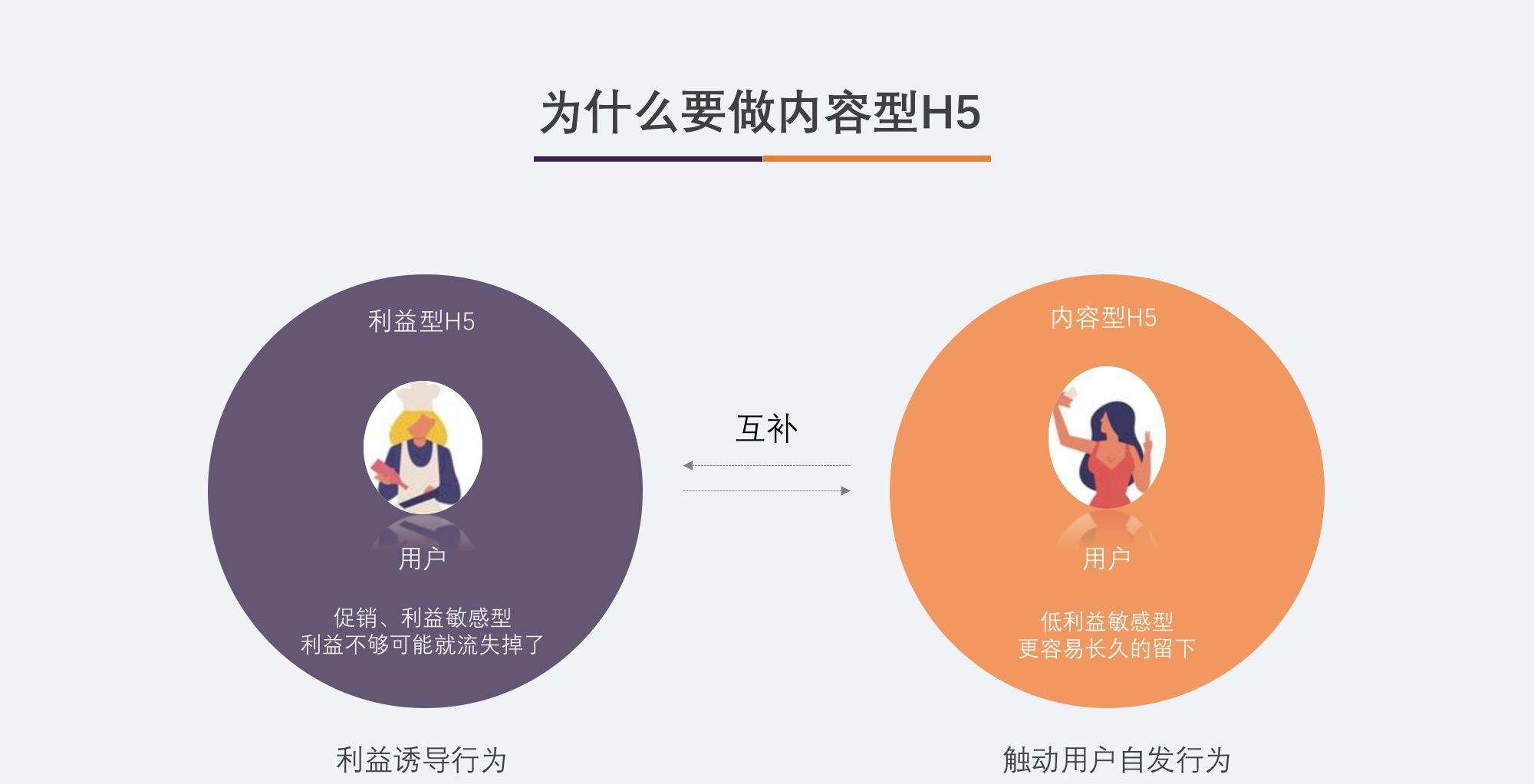 为什么要做内容型H5,它与利益型H5是互补的关系。利益型H5一般面向的是对促销、利益敏感型的用户,通过利益点来诱导用户参与活动,缺点就是利益点不够,用户可能就流失掉了。而内容型H5通过一些情感化的设计,吸引低利益敏感性客户,触发用户自发参与活动。