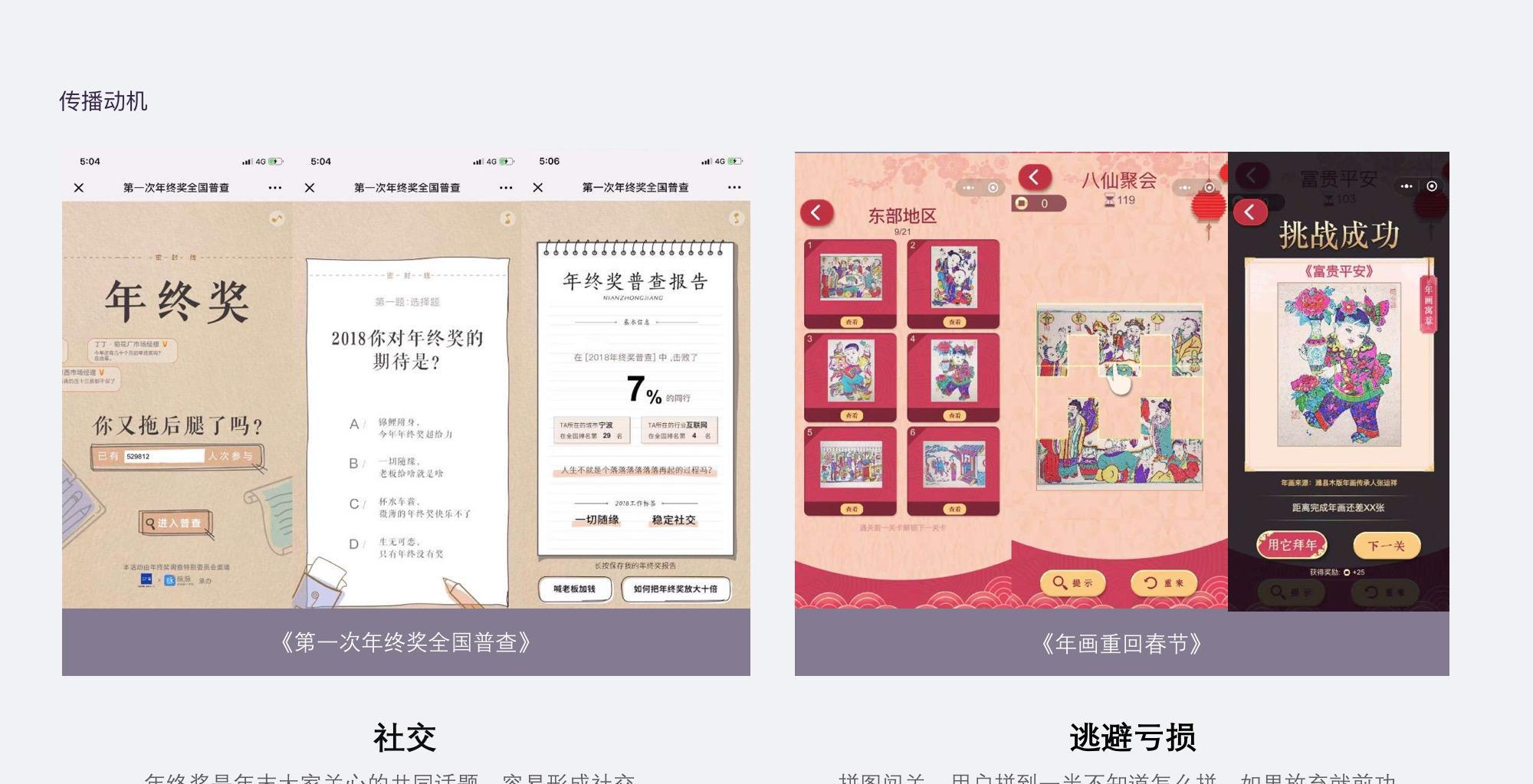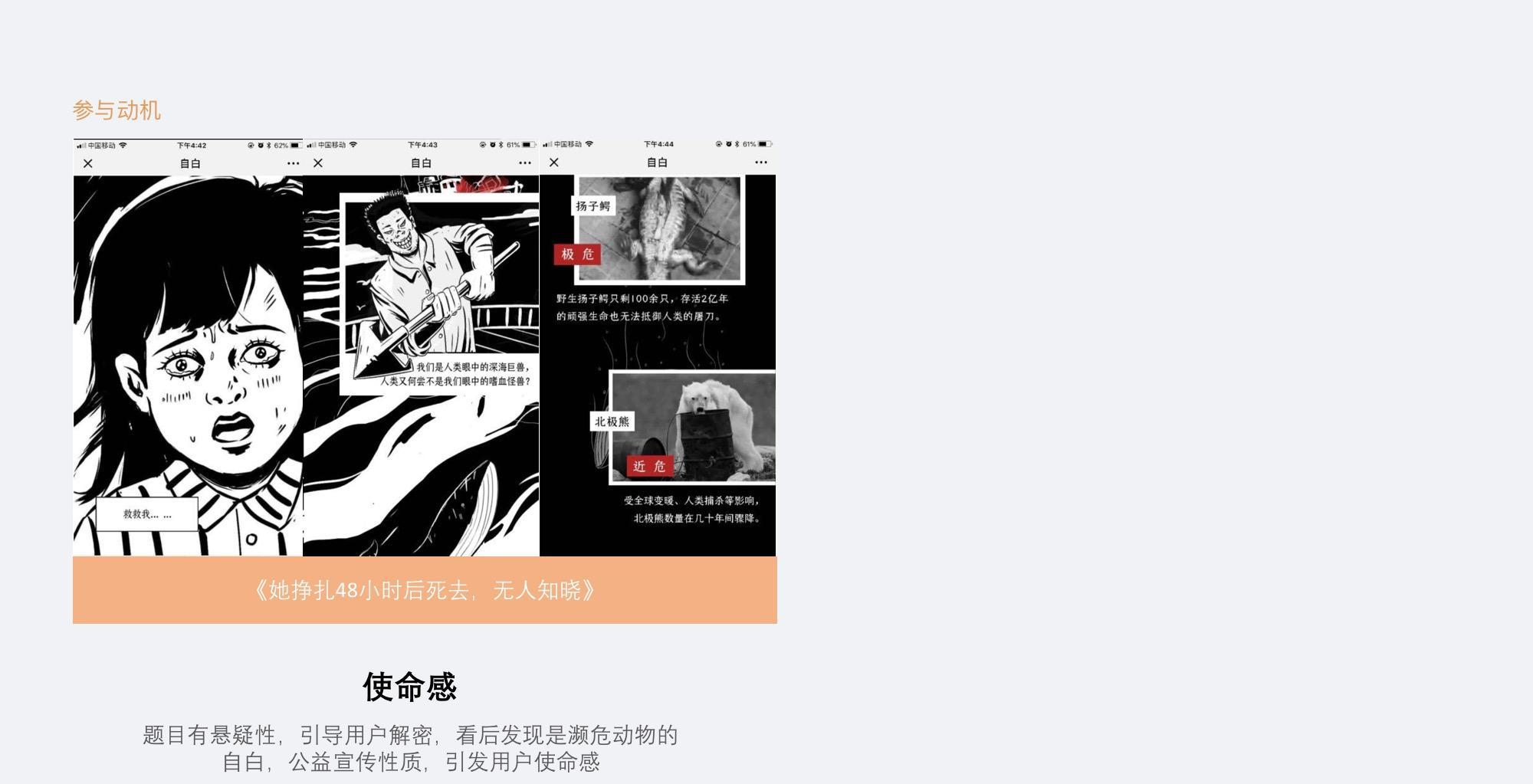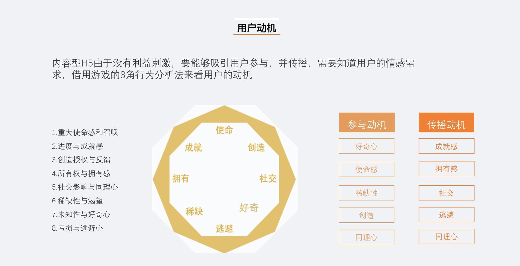 内容型H5由于没有利益刺激,要能够吸引用户参与,并传播,需要知道用户的情感需求,借助游戏的8角行为分析法来看用户的动机。可以分为参与动机、传播动机,参与动机包括好奇心、使命感、稀缺性、创造、同理心;传播动机包括成就感、拥有感、社交、逃避、同理心。
