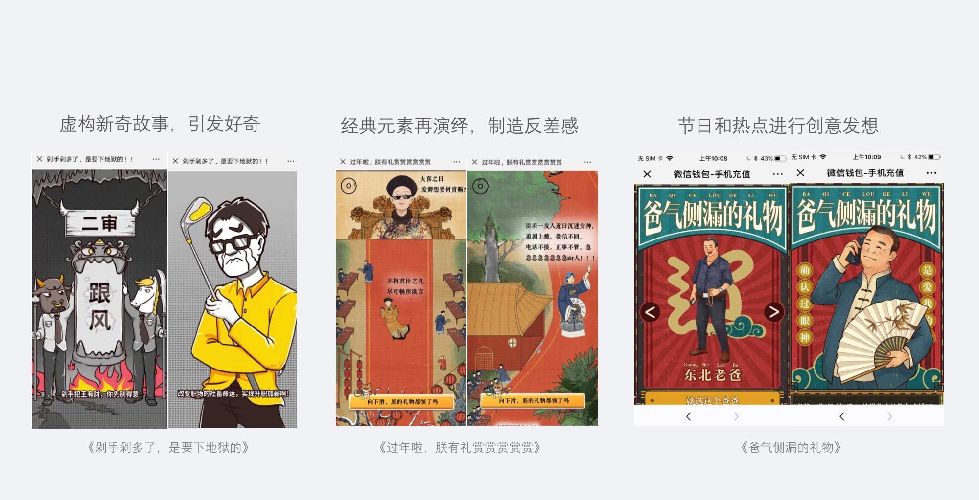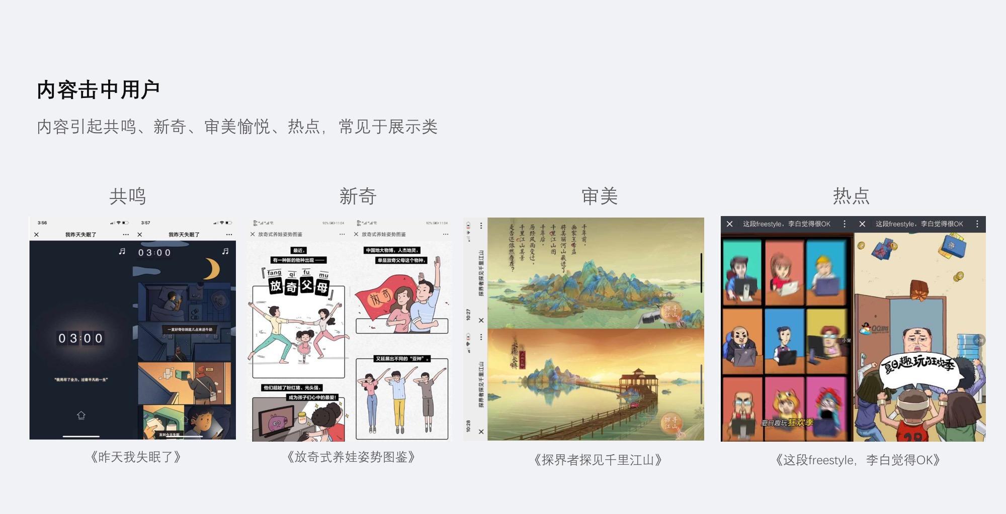 内容型H5,主要指靠内容本身吸引用户,从而产生传播的H5,区别于利益驱动型H5,关注用户的情感需求,用户的目的性较弱,主要用于传播、拉新、宣传等。