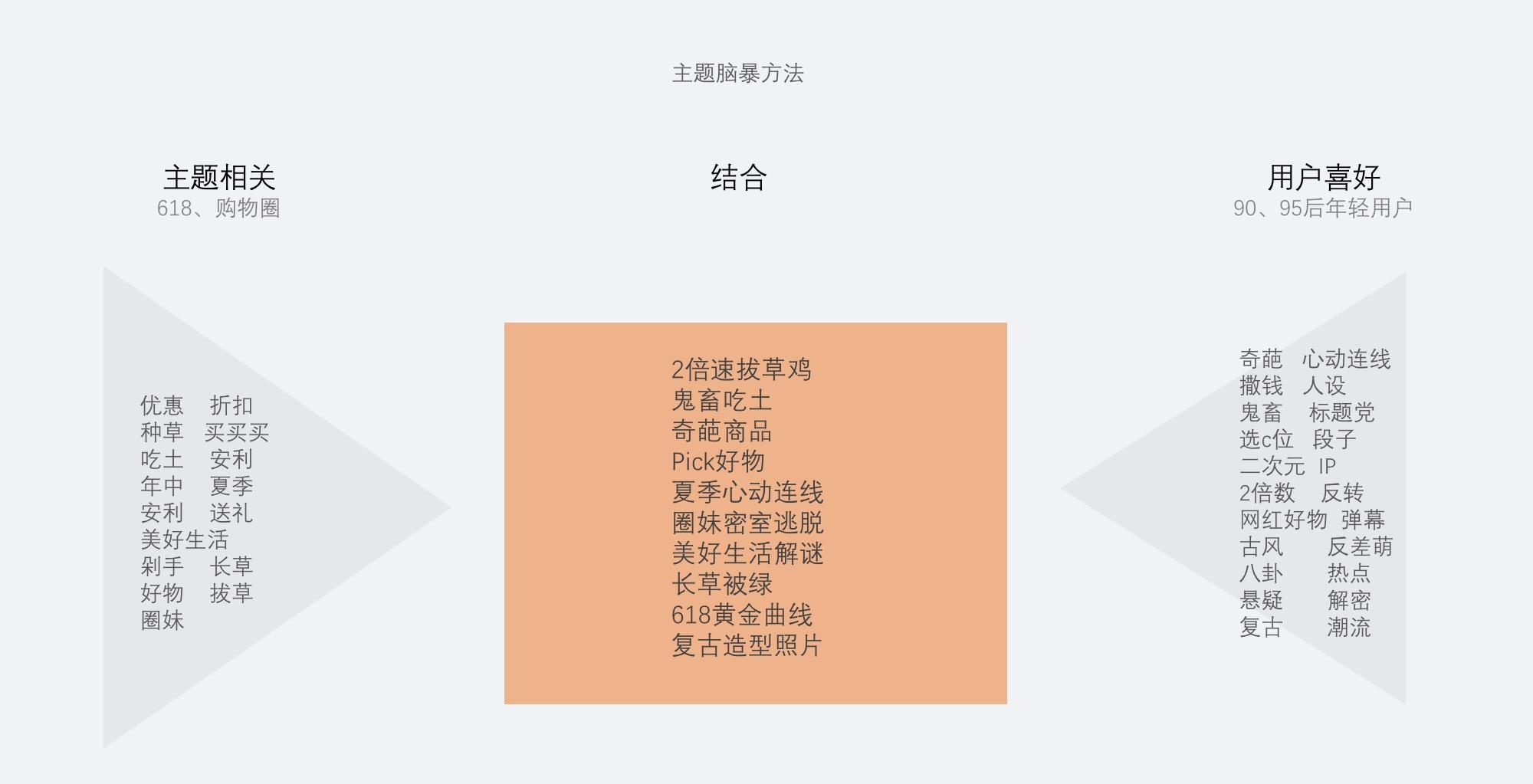 可以根据本次活动主题发散出关键词,然后分析出目标用户喜好的关键词,将两者结合起来组成一些有意思的主题,从里面选择主题贴合度、趣味性、传播性都较高的主题采用。