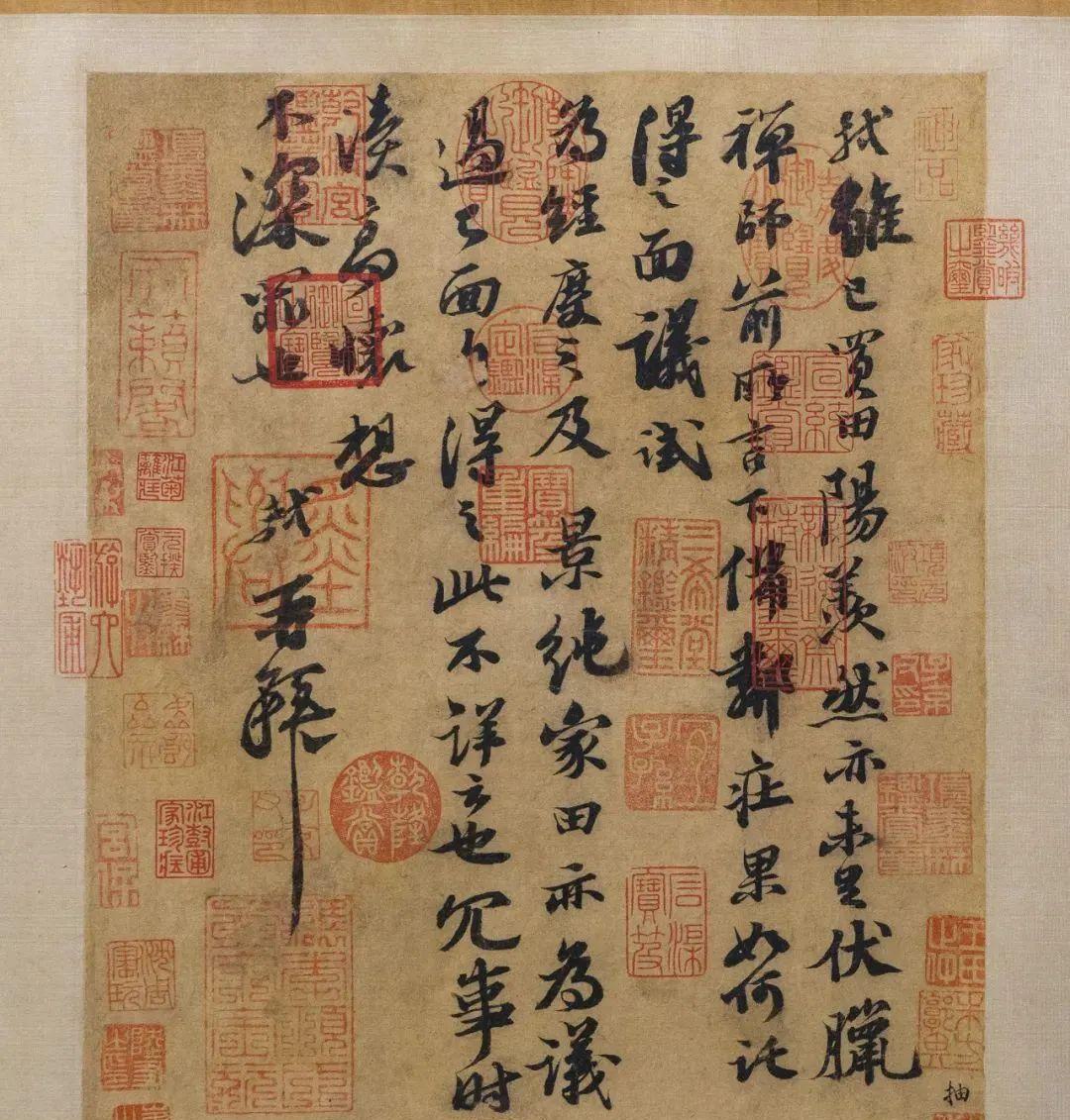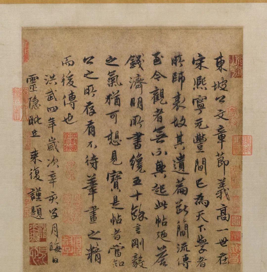 《阳羡帖》是苏轼关于阳羡买田信札的后半部分,虽然只有60余字,但每个字里都蕴含着浓厚的笔墨,展现出苏轼晚年的风采。作品书体刚健阿娜,优美动人,帖中还留有元、明、清三代收藏者印章及清内府藏玺。元代郭畀、陆友,明代沈周、崔深、项元汴,清初元揆曾收藏此帖;信札后有元末明初名僧来复、明董香光、项元汴等题跋钤印,珍贵无比。乾隆年间入内府收藏,清代几个皇帝在上面盖了各种印章,有些过于繁杂,却留下了历史的印记。据《石渠宝笈续编·乾清宫》记载,如今仅存明初灵隐比丘来复行书跋文。