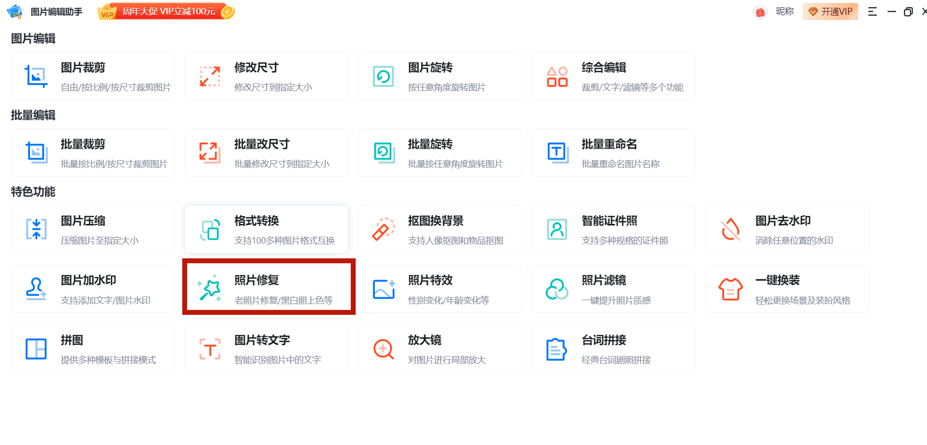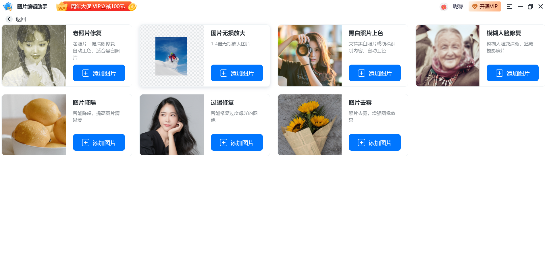 图片编辑助手能够满足我们对图片编辑的任意需求,使用这个软件,小白也能进阶成图片处理大师。这个软件的照片修复功能包括老照片修复、图片无损放大、黑白照片上色、模糊人脸修复、图片降噪、过曝修复和图片去雾七大功能。像是一些老旧的照片,使用这个软件,直接一秒钟就可以让它变得清晰。
