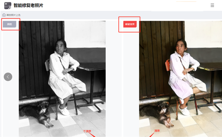 AI自动上色完成后,界面呈现清晰的“原图和上色后对比图”,满意的话直接保存即可