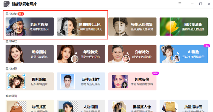 进入界面后,各功能一目了然,选择顶部的【老照片修复】功能,上传需要修复的照片,软件会自动上色!方便至极!