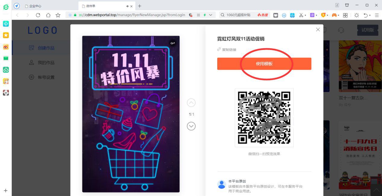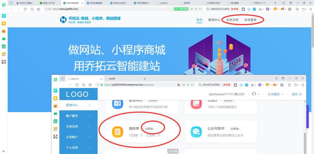 2、注册乔拓云账号后登录到乔拓云的后台,在微传单的这个通道处点击【去管理】即可打开H5页面的模板中心。