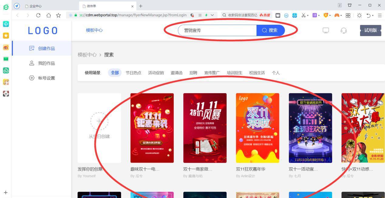 3、进入模板中心,搜索找到你所需要的关键词,比如营销宣传。然后打开模板。