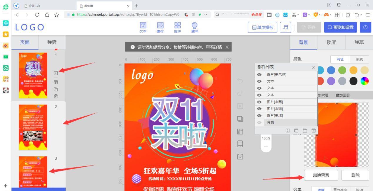 4、模板的编辑过程,都是可视化的编辑,双击图片,文字,即可修改上面的内容。一个页面一个页面的更改,完成后点击预览。